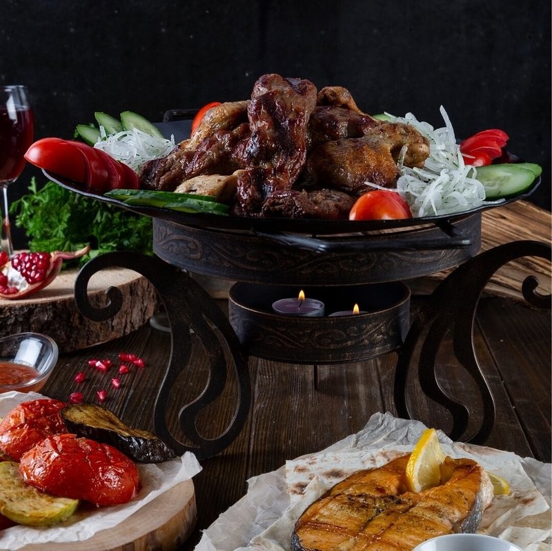 В меню представлены холодные закуски из свежих овощей, зелени и морепродуктов, большое разнообразие оригинальных салатов, супы на наваристом бульоне, шашлыки из курицы, баранины, свинины и сёмги с пикантными соусами, сочные люля-кебаб, стейки, манты, рассыпчатый плов, лагман, долма и другие вторые блюда, несколько видов гарниров, румяная выпечка, изысканные десерты к чаю и мороженное.